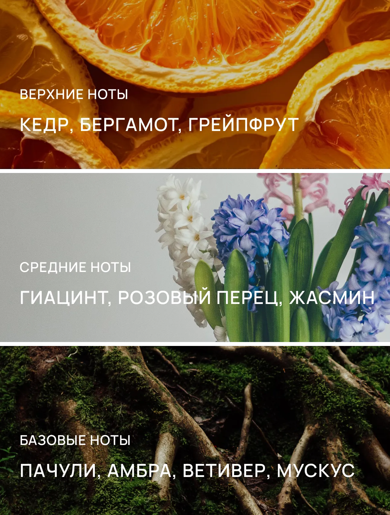 Открытие строится на цитрусово-древесном контрасте: бергамот и грейпфрут дают сухую, прозрачную свежесть без сочной фруктовости, а кедр сразу формирует холодный древесный каркас. Цитрусы работают не как яркий акцент, а как инструмент чистоты и направленности, подчёркивая строгую структуру старта.