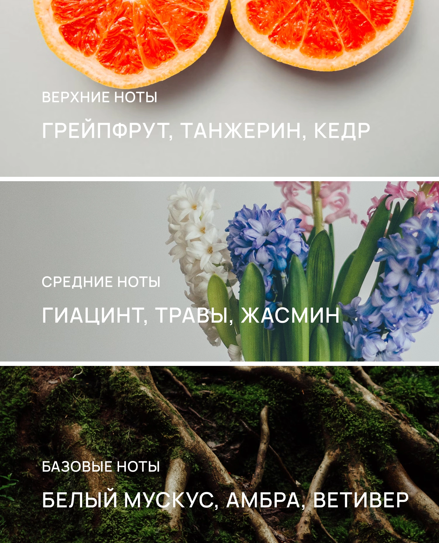 Аромат открывается свежестью грейпфрута и танжерина, подчеркнутой сухой древесностью кедра. Первое впечатление — энергичное и ясное, с лёгкой горечью цитрусов.